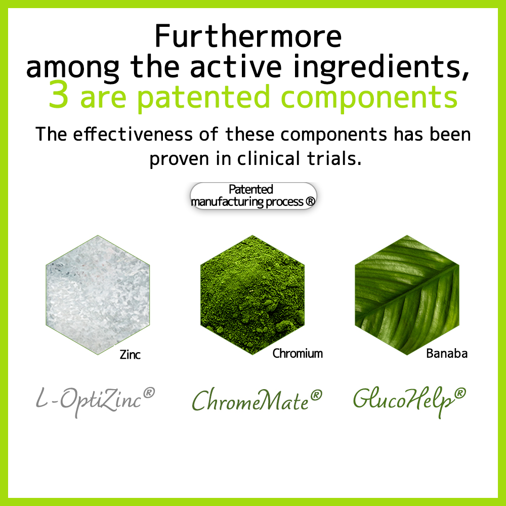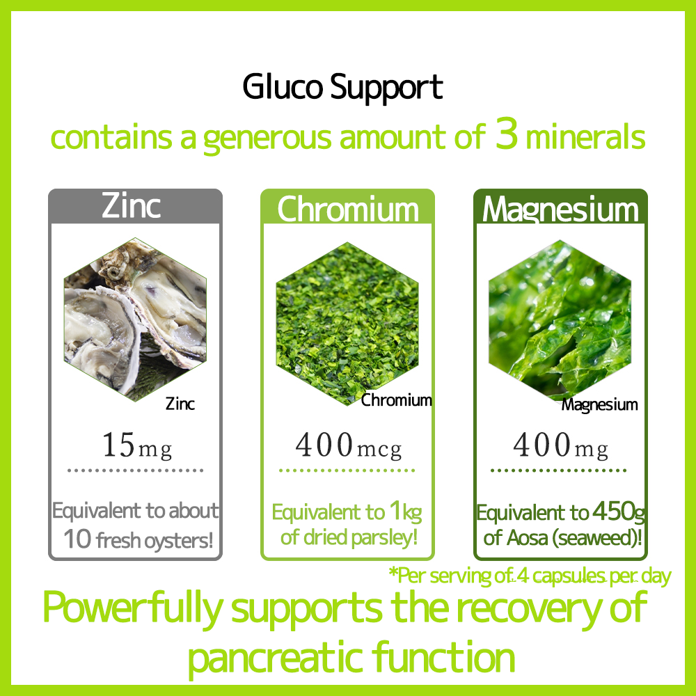 一款內含 3 種礦物質,能調節胰島素分泌,使血糖降低的保健食品。鋅以及其它 17 種有效成分能幫助胰島素分泌,抑制突然升高的血糖!有血糖過高煩惱的人,只要 1 天 4 粒,就能確實幫助調節血糖。