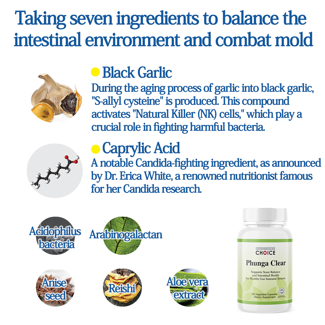 從體內由內而外真正清除黴菌。醫師之選研發的體內清菌膠囊,內含11種經臨床實驗証實有效的成分,能有效去除人體內霉菌。