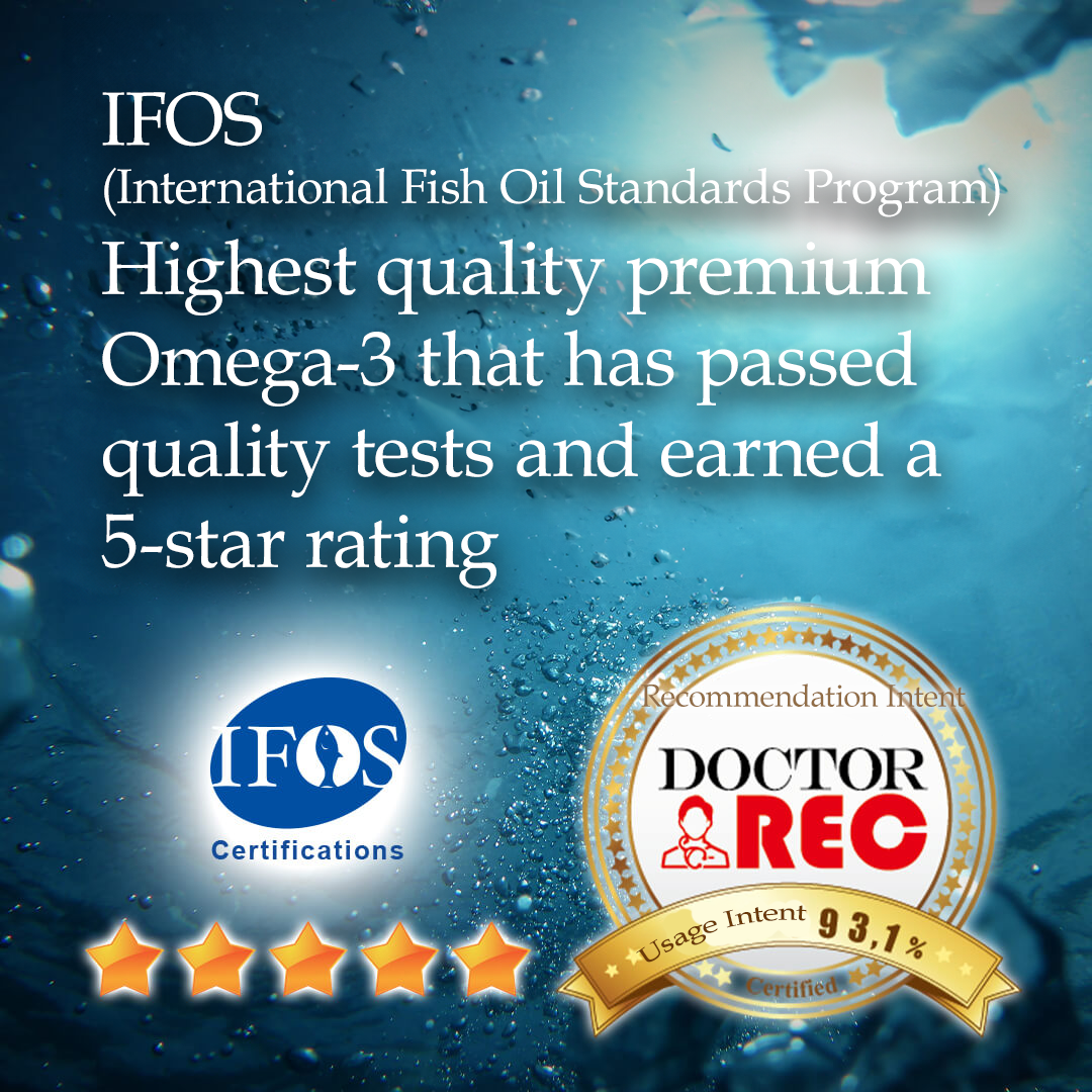 醫師問卷:93.1%的醫師都表示會推薦給病患服用!獲得IFOS(國際魚油認証機構)5星評價,安全最高品質優質魚油Omega3。
